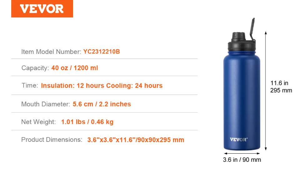 The VEVOR stainless water bottle, 40 oz, is so easy to use thanks to its wide mouth opening. You can add ice cubes, fruit slices, or protein powder to it without spilling. It is also easy to clean; all one needs is a cleaning brush to clean every corner of the inside.