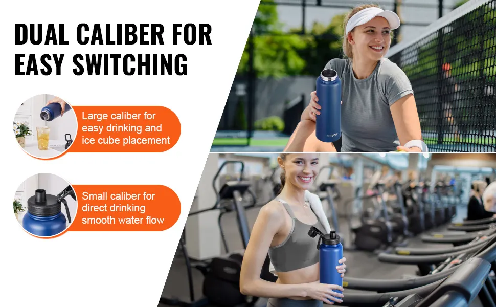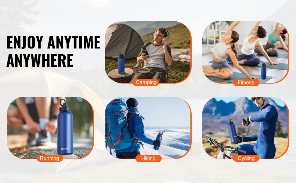 This double-walled construction ensures your drinks stay at the right temperature and adds toughness to the bottle. It resists drops and bumps without denting. Reusable stainless steel bottles reduce plastic waste and are therefore environmentally friendly. The VEVOR stainless steel water bottle is a durable product that ensures safety, strength, and sustainability.