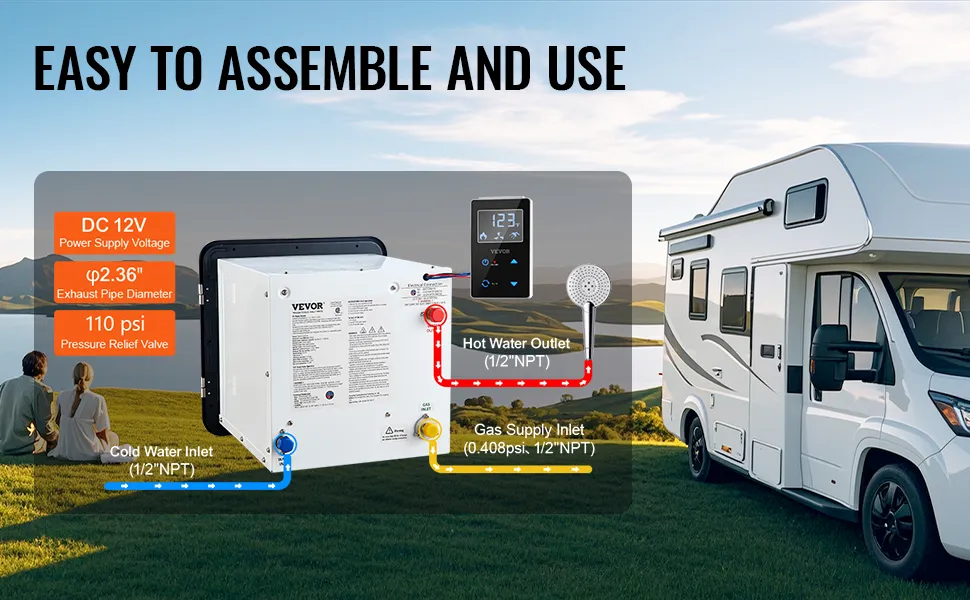 Installing this instant hot water heater for a camper is quick and easy with its smart, travel-ready design. With door dimensions of 15 x 15 inches and a compact rear chamber measuring 12.6 x 12.6 x 14 inches, it’s built to fit seamlessly into most RVs without the need for complicated adjustments. It has standard 1/2" NPT water and gas connectors, along with a 2.36" exhaust pipe. This makes hookups simple and reliable. The straightforward connections mean you can get it set up in less time and hit the road sooner. You can enjoy hot water on any trailer without delays or extra hassle.