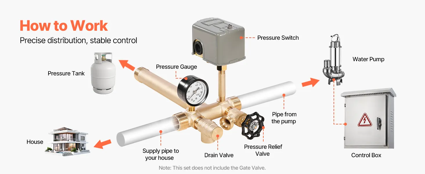 Maintain smooth water flow with this water pressure control system designed for dependable, automatic operation. The built-in pressure switch manages pump activity between 40 and 60 PSI, ensuring consistent delivery while preventing overpressure damage. The relief valve adds an extra layer of safety, while the drain valve allows easy maintenance. Whether for household plumbing or irrigation, this smart system keeps your water pressure balanced, protects your equipment, and extends the life of your entire setup.