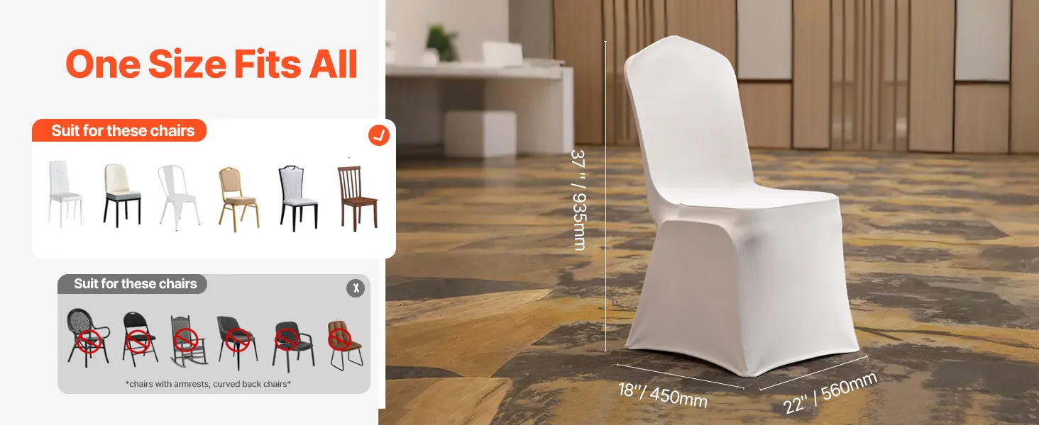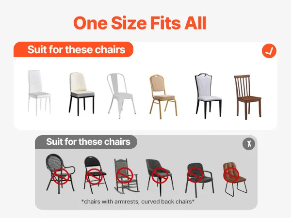 Compatibilidad con varias sillas: Las fundas plegables de spandex elástico tienen un tamaño moderado y se adaptan a la mayoría de las sillas sin reposabrazos, incluyendo sillas de comedor, apilables y de banquete. Se adaptan a sillas de dimensiones (An. x Pr. x Al.): 560 x 450 x 935 mm (máx.).