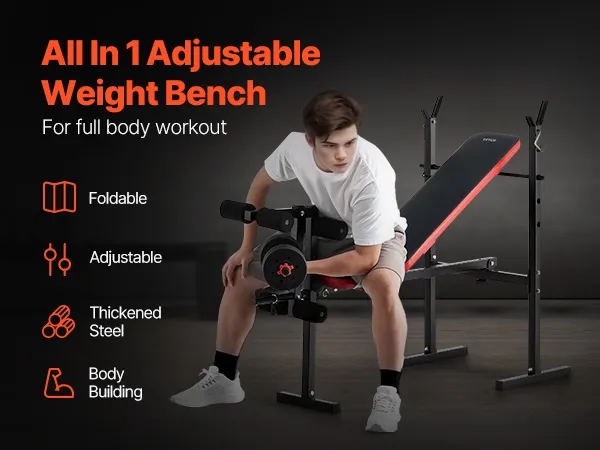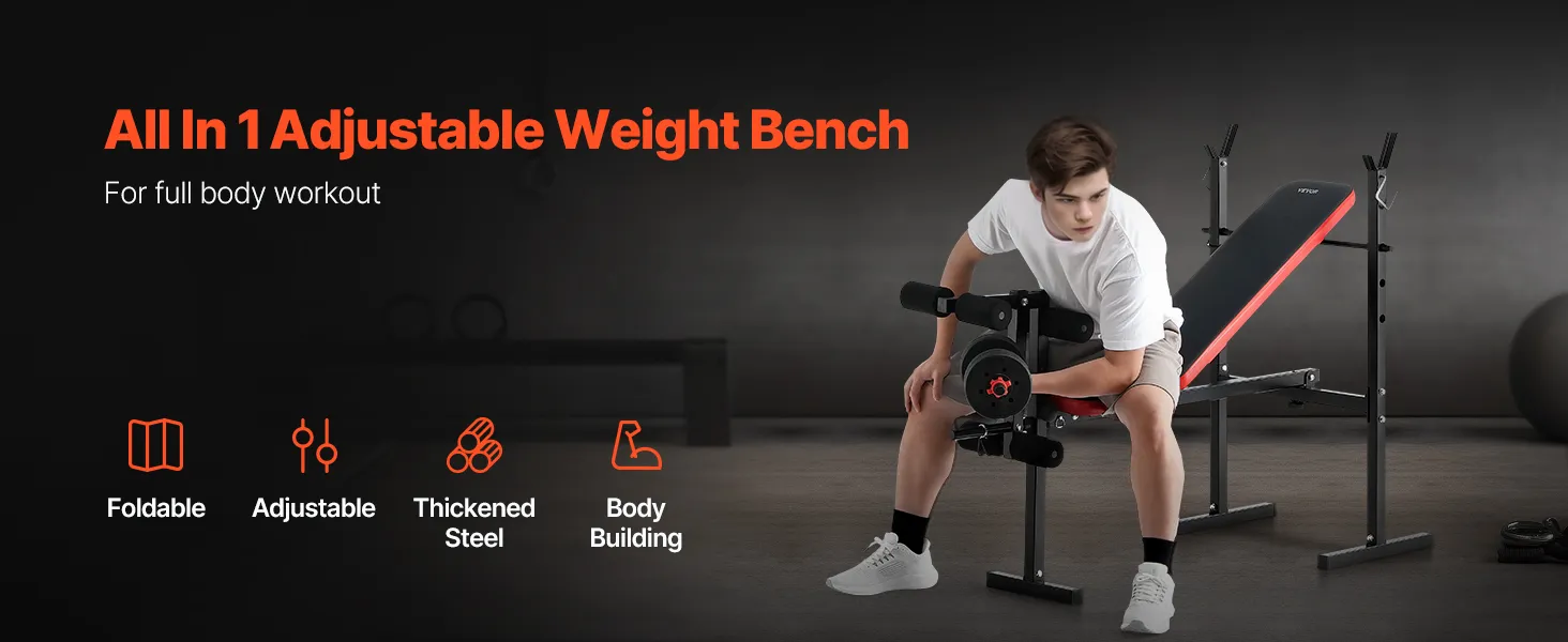 Banco de pesas VEVOR, banco de pesas ajustable multifuncional para entrenamiento de cuerpo completo, banco de abdominales de 380 lb para entrenamiento de fuerza en gimnasio en casa, banco plano con plegado y ajuste rápidos