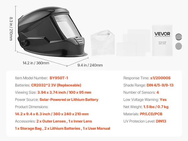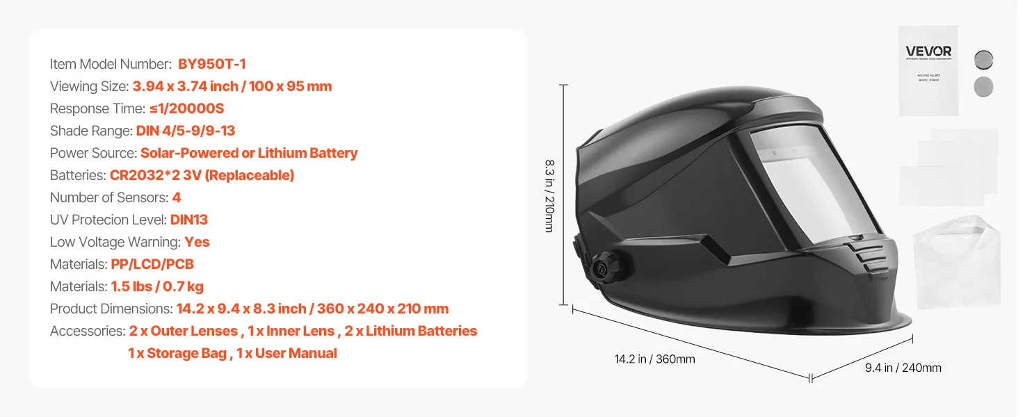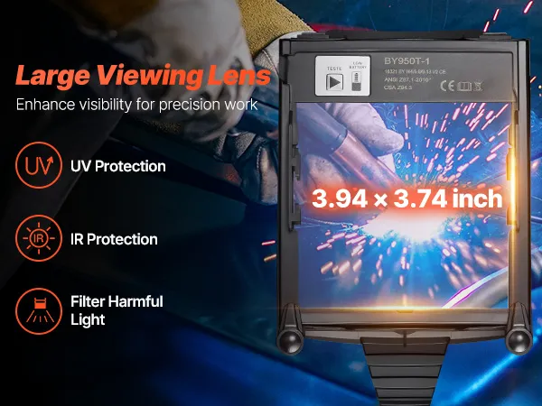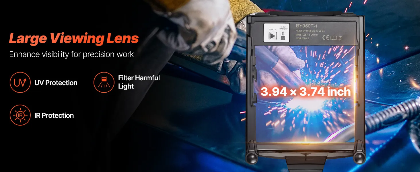 Large & True Color Viewing: Featuring a 3.94" x 3.74" (100 x 95 mm) large viewing screen, upgraded true color technology and 1/1/1/1 optical clarity, the VEVOR welding helmet gives you a clear, sharp, natural view for safer and more precise welding