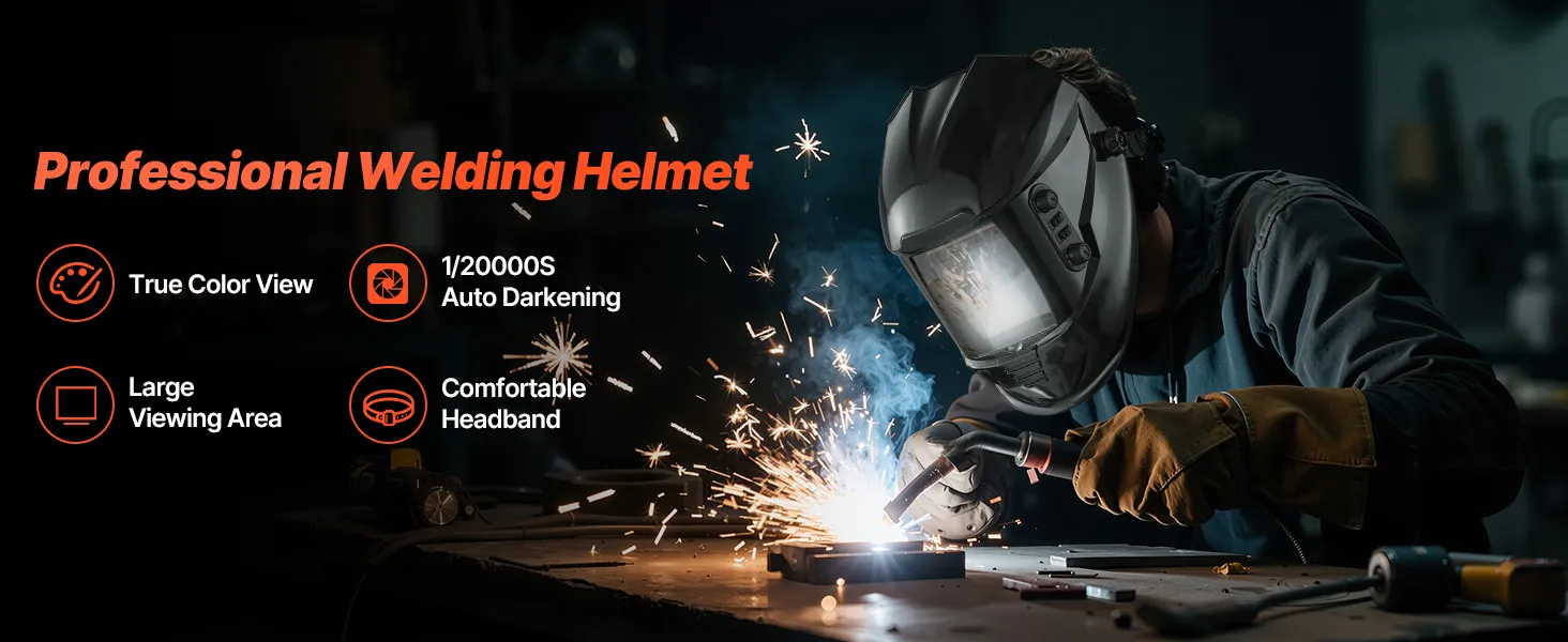 VEVOR auto-darkening welding helmet features a DIN 4/5–9/9–13 wide shade range, true color tech, and 4 arc sensors, delivering a clearer, more natural viewing experience. It efficiently filters harmful light, reduces eye fatigue, and ensures safer grinding, welding, and cutting operations.