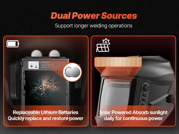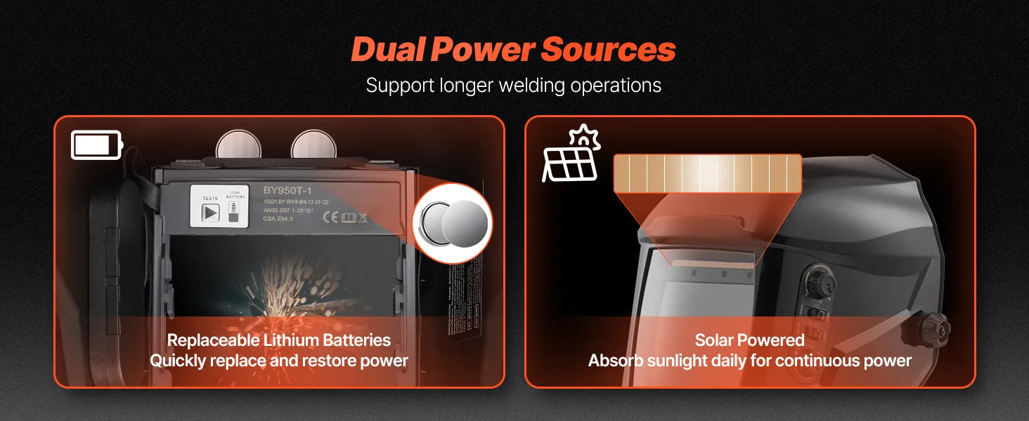 Solar Charging: This auto-darkening welding helmet features 2 lithium batteries and supports solar charging, eliminating the need for frequent battery replacements. The stable power supply ensures consistent, long-lasting performance