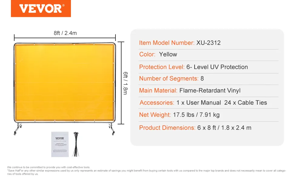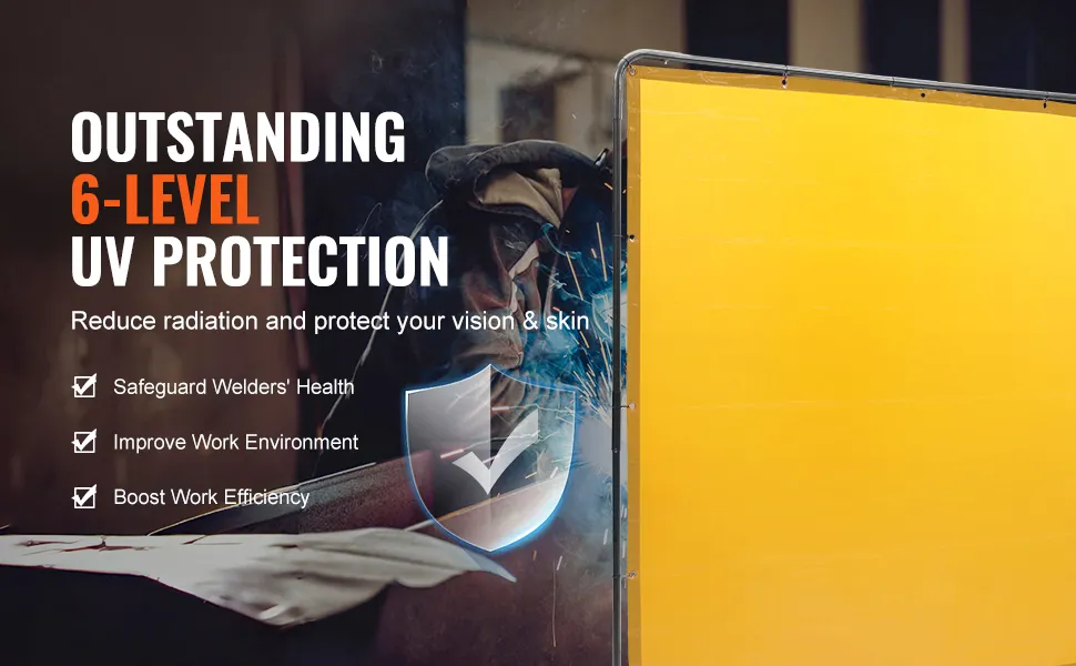 Are you ready to take your welding safety to the next level? Look no further! VEVOR 6x8 FT welding screen with frame is here to offer outstanding flame resistance, 6-level UV protection, stable frame and 360° rotational wheels, making it the ultimate companion for secure and efficient workspace.