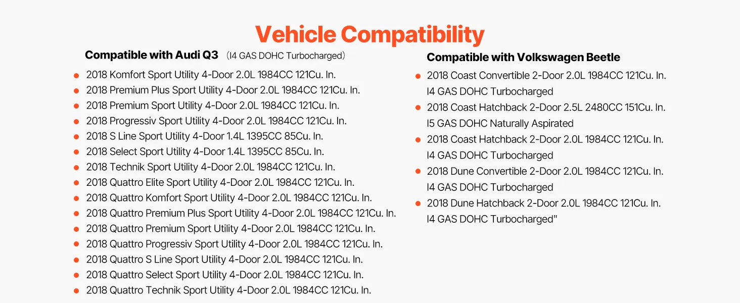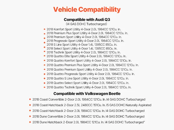 Vehicle Fitment: This wheel hub assembly is tailored for specific models, compatible with 2018 Audi Q3 Komfort and Volkswagen Beetle Coast Convertible vehicles. Note: Please check the fitment chart on the page to confirm compatibility with your car
