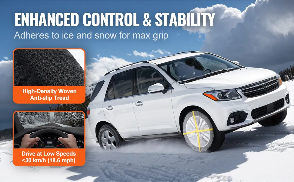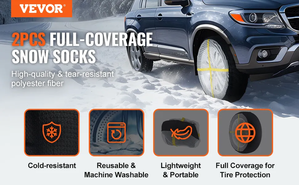 The VEVOR tire sock is engineered from high density polyester fiber, giving it the strength and resilience needed for winter emergencies. On surfaces coated in snow or ice, this thick material can withstand extremely low temperatures without breaking or shattering. To help drivers stay steady during winter driving, the sturdy fabric enhances grip while remaining sufficiently flexible to fit tightly to the tire's shape.
