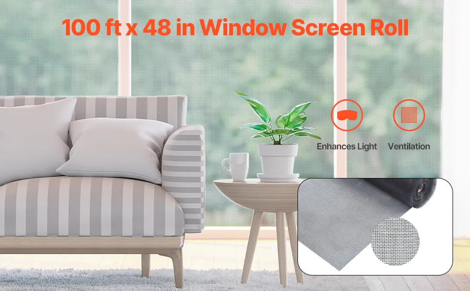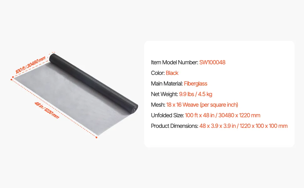 Made from durable fiberglass window screen mesh, this product is fire-resistant and tear-resistant. Measuring 100 ft x 48 in with an 18 x 16 weave (per square inch), it’s easy to cut and install as a window screen replacement, offering dust protection, shade, and great ventilation.