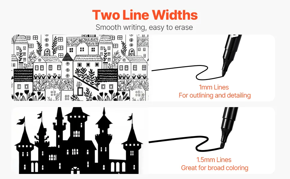 Chisel Tip for Versatile Lines: The chisel tip of these black dry erase markers creates lines from 1-5mm thick, depending on grip angle and pressure. Whether for precise detailing or bold coloring, they handle any task with ease.