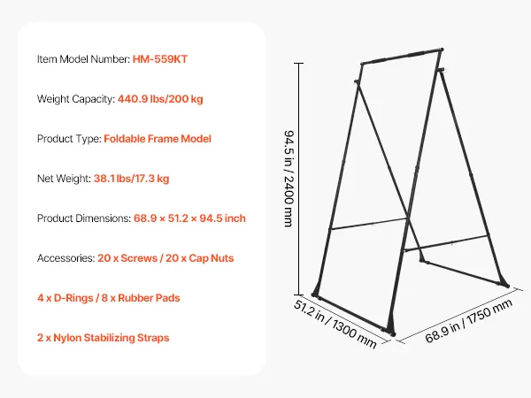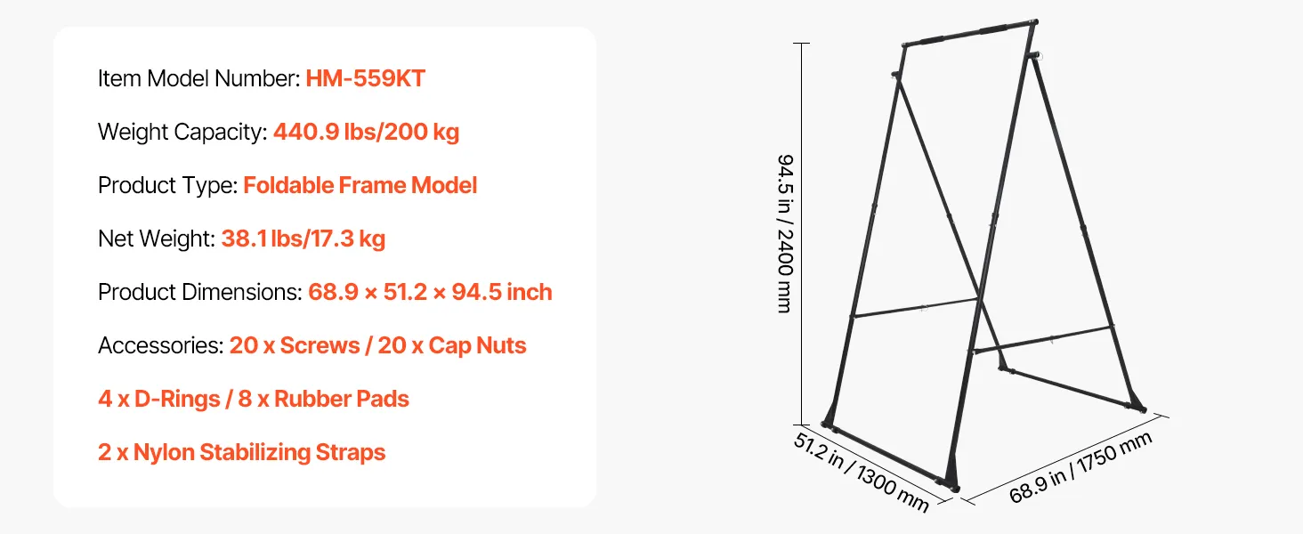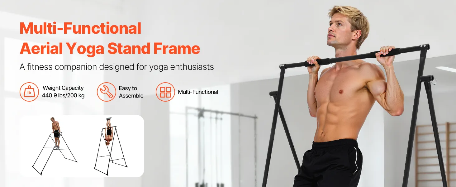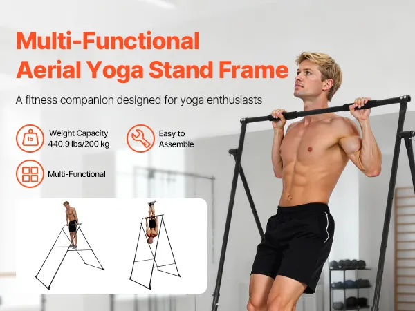 Heavy-Duty Frame: This yoga swing stand combines lightweight with impressive strength. Weighing just 38.1 lbs/17.3 kg, it supports up to 440.9 lbs/200 kg thanks to its high-quality steel structure. Ideal for yoga enthusiasts and pros, the frame provides a stable platform for every stretch and inversion