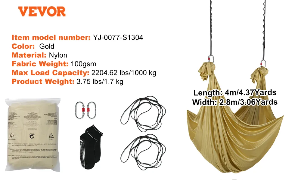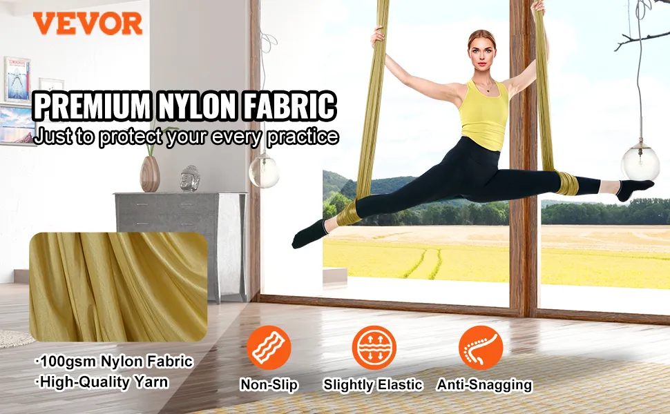 The VEVOR aerial yoga hammock is made from 100 gsm nylon fabric. This material offers both security and comfort in the process. The thicker weave of the fabric ensures a sense of security. Its excellent elasticity provides comfort and durability. It is soft and long-lasting. Therefore, you can use it for extended periods. Whether you are a newbie or an advanced practitioner, this hammock will meet your needs. Material quality ensures you can focus on your practice without worrying about the hammock's longevity. Fabric is gentle on the skin, allowing for a better yoga experience.