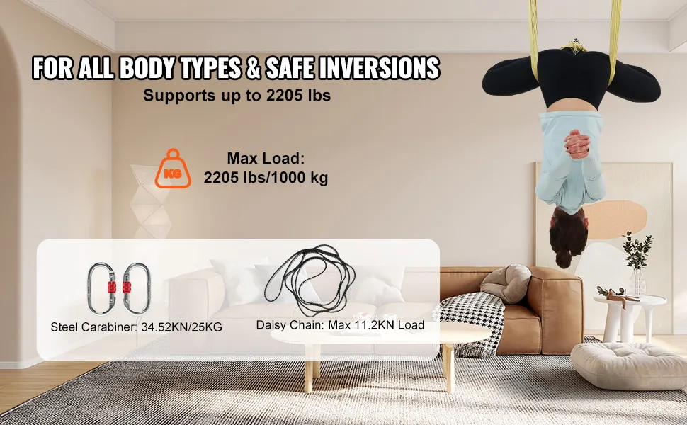 The aerial yoga hammock can hold a maximum weight of 2204.62 lbs. It ensures your safety, even during advanced moves like inversions and spins. You can trust the hammock to support you securely. It makes it suitable for users of all weights and sizes. The strong design guarantees that the hammock will not fail under pressure. Knowing that this hammock has your back, you can confidently perform any yoga pose. This safety feature makes it a dependable choice for home and studio use. Strong fabric and hardware provide peace of mind for all users.