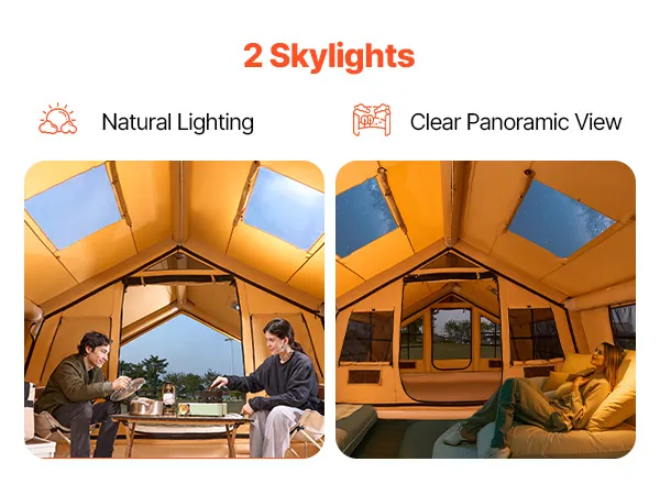 Excelente ventilación: Esta tienda de campaña inflable cuenta con dos grandes tragaluces para disfrutar de vistas panorámicas y observar las estrellas. La espaciosa puerta principal se abre completamente y las cuatro ventanas laterales garantizan una ventilación óptima. Con mallas antipolvo y puertas con cremallera, su tienda inflable se mantiene segura y cómoda, incluso de noche.